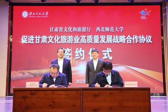 5月12日,省文旅厅与西北师范大学签署《促进甘肃文化旅游业高质量发展战略合作协议》。省委宣传部副部长、省文旅厅党组书记、厅长陈卫中,西北师范大学党委书记张俊宗出席签约仪式并致辞。省文旅厅党组成员、副厅长万学科,西北师范大学副校长李朝东代表双方签约,西北师范大学副校长邓小娟主持签约仪式。