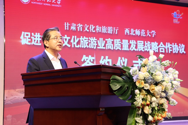 张俊宗在致辞中表示,省文旅厅近年来注重规划建设、乡村旅游、非遗传承、文物保护、艺术展演和产业发展等工作,不断统筹高效管理,深挖文化旅游资源,促进文旅产业发展,引领全省文化和旅游事业快速发展,成果卓著。西北师范大学文化旅游和艺术学科办学优势显著,是全省文化旅游业发展相关学科门类最全、层次最高,办学条件优良、高层次人才汇聚的高校。双方的战略合作将为甘肃省文化旅游事业高质量发展注入强大动力,为助力甘肃“四强”发展战略贡献智慧和力量,并主动顺应形势任务变化,准确把握政策导向,创新模式,全方位共同推进甘肃文化旅游业高质量发展。