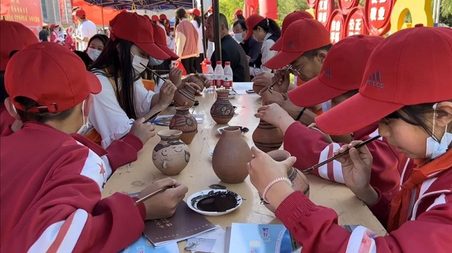 文艺演出结束后,来自临夏市实验小学和临夏现代职业学院的学生,在临夏州各县市博物馆体验区沉浸式感受了彩陶绘制等特色项目。