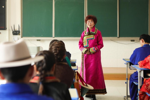 2008年,蒙古族服饰被列入第二批国家级非物质文化遗产名录,娜仁其其格于2018年被评为第五批国家级代表性传承人。近年来,她多次举办蒙古族服饰制作培训班并外出授课,推广民族服饰文化,受到各族群众的一致好评。娜仁其其格自小跟随奶奶做传统蒙古族服饰,是该传统服饰第四代传承人。“雪山蒙古族服饰是肃北蒙古族民众在长期游牧生活和生产实践中不断传承和发展而成的,服饰是民族文化最直观展示。作为一个蒙古族人,我从小就喜欢这种服饰,借助服饰让大家把传统文化‘穿’在身上是我最喜欢干的事情。今后我将一如既往,将蒙古族服饰制作的手艺传承下去。”娜仁其其格说。