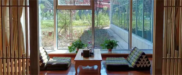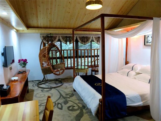 这里依山傍水,环境清幽。归园田居的房间都为270度全山景房,房间内用的都是原木家具,清新典雅中又不失生活情调。