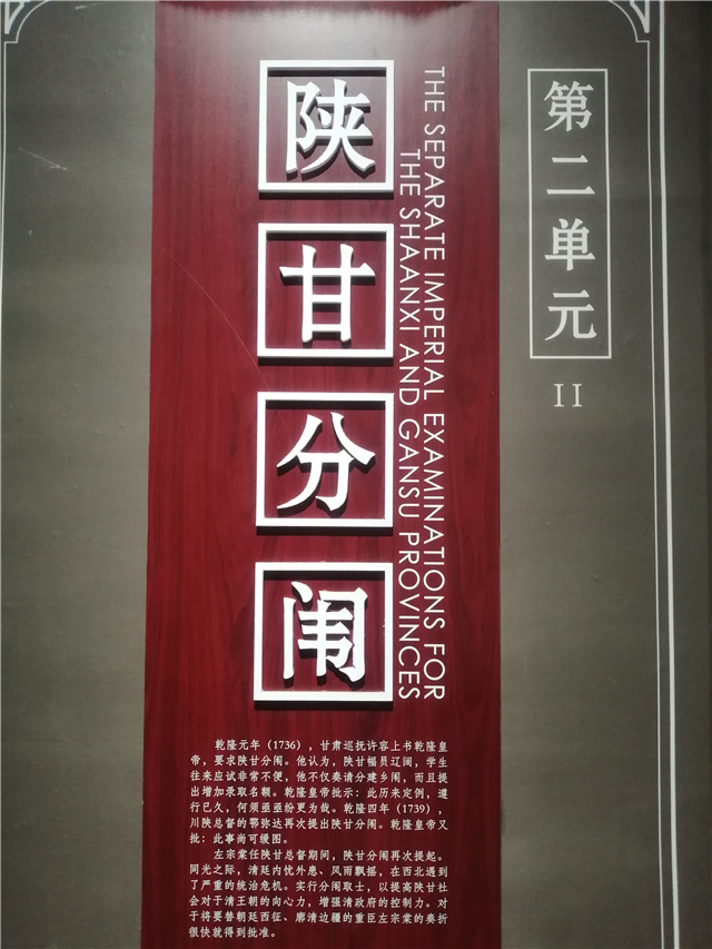 光绪元年(1875年)陕甘分闱,这是中国科举史上的重要的历史事件。1873年左宗棠上书朝廷,《请分甘肃乡试并设学政》奏折虽历经重重困难,但终被朝廷批许,光绪元年(1875年)甘肃贡院落成,当年8月9日举行了陕甘分闱后第一次乡试,与试者2700余人。陕甘分闱,甘肃贡院的建成推动了甘肃的文教事业发展,意义深远。该单元展出的左宗棠亲笔所书的匾额及楹联在全国现存的贡院中凤毛麟角,弥足珍贵。