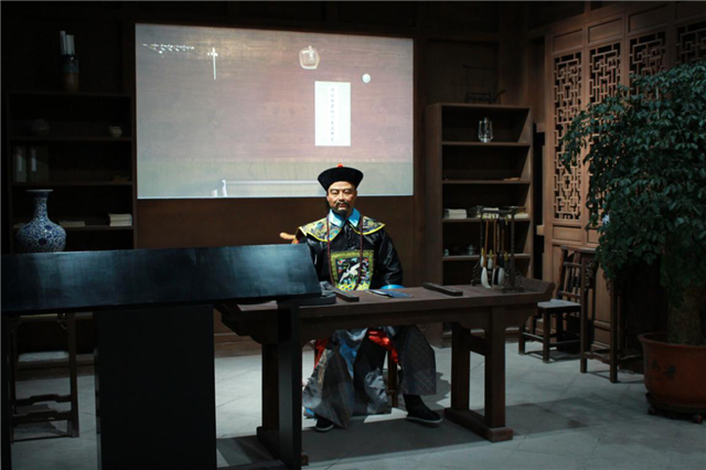 模拟左宗棠写奏折时的实景场景,其背后的投影动画详细介绍了士子进入甘肃贡院考试的过程