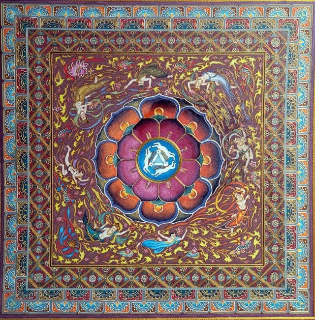 李海明正在制作一幅与《宝相花藻井》相似的作品,“图案是一样的,但是色彩不一样,那幅作品的颜色已经很难再现,这既是缺失的遗憾,也是手工艺术的魅力吧。”