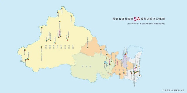 现在,送你一张来自该图册中的西北地区国家5A级旅游景区分布图,欢迎全国游客前往旅行体验,共同感受丝绸之路上的最美风景。