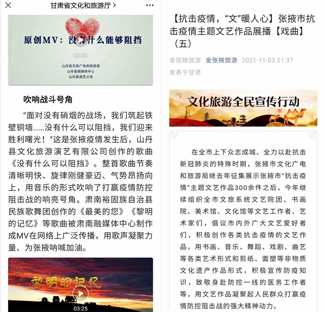 五是支持抗疫文艺创作,凝聚抗疫强大能量。疫情期间,在全市上下众志成城、全力以赴抗击新冠肺炎的特殊时期,张掖市文化广电和旅游局继2020年征集展示张掖市“抗击疫情”主题文艺作品300余件之后,2021年继续倡议全市文艺工作者、非遗传承人、文艺爱好者们,积极创作各类抗击疫情的文艺作品。据不完全统计,去年10月至11月共创作抗击疫情文艺作品373件,其中音乐作品41首,戏曲、曲艺、舞蹈等作品20件,书法绘画作品285幅,散文诗歌26篇,通过“金张掖旅游”微信平台编发专题展播20期,省、市、县(区)各级媒体平台刊发阅读量累计达100多万人次。