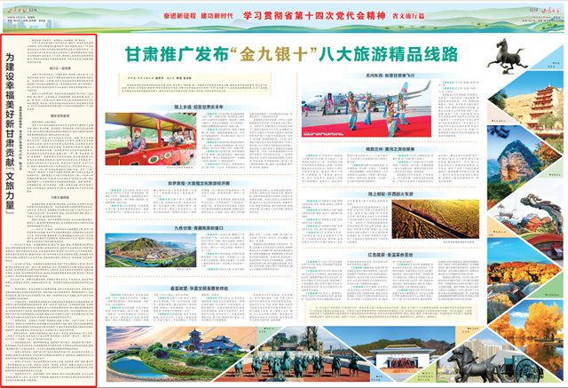 省第十四次党代会报告就今后五年全省改革发展制定了蓝图目标,明确了重点举措。我们将进一步对标对表,不断完善文旅发展方案,努力让富民兴陇宏伟蓝图更加饱满多彩,切实为建设幸福美好新甘肃提供思想支撑、精神支撑和文化支撑。