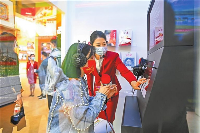观众在甘肃单元体验《读者》朗读亭。