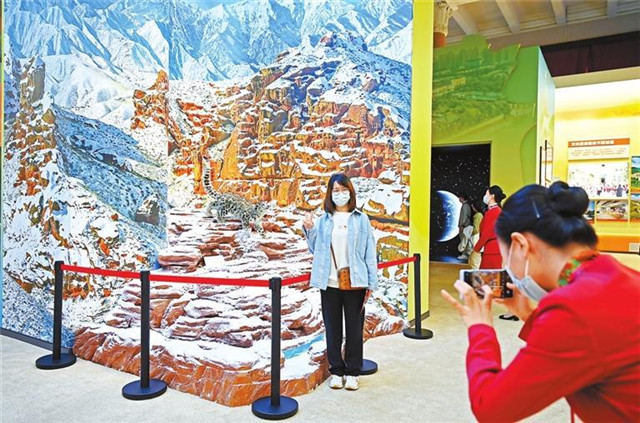 观众在甘肃单元展出的祁连山雪豹模型前拍照留念。