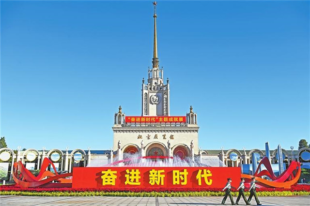 金秋时节的北京,碧空如洗,北京展览馆门前,红色波浪形雕塑和巨型喷泉,把“奋进新时代”五个大字衬托得庄重夺目。
