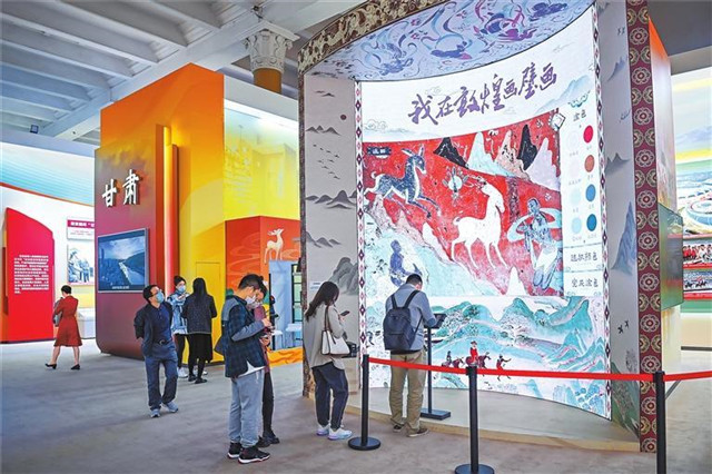 位于5号展馆的甘肃单元,由“苦贫褪尽甘味来”“黄河之滨添壮美”“富民兴陇谱新篇”“丝路古道文脉兴”“陇原儿女多奇志”5部分组成,200余平方米的展区里,50张图片、5个视频、25件实物、4组模型,向前来参观的人们讲述着党的十八大以来,甘肃省认真贯彻落实习近平总书记对甘肃重要讲话和指示精神,奋发争先、砥砺前行的故事。其中,《脱贫攻坚责任书》、“一户一策”脱贫计划等实物,真实展现了甘肃如期打赢脱贫攻坚战、552万农村贫困人口实现脱贫的重大成就;沙漠能源生态圈模型,展示了近年来甘肃省持续推进生态文明建设取得的成果;采用仿真数字技术打造的“我在敦煌画壁画”互动项目、栩栩如生的祁连山雪豹模型、沉浸式阅读新方式《读者》朗读亭等,为观众带来了耳目一新的观展体验,备受观众青睐。