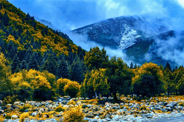 远处的雪山与森林的绚烂遥相呼应
