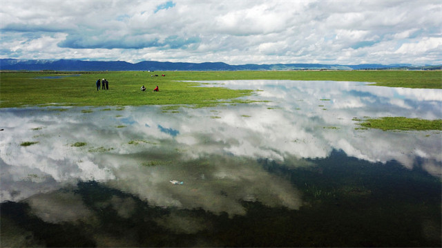 游客在甘肃省甘南藏族自治州玛曲县河曲马场的湿地游览(2019年6月22日摄)