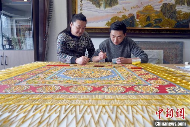 图为李海明工作室内展出的掐丝珐琅画作品。九美旦增 摄