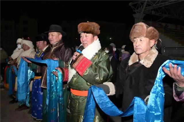 近日,蒙古族祭火节仪式在酒泉市肃北县文化体育广场举行。活动由“镰点火”“祭火祈福”“诵经招福”“分享祭品”等依次进行,在熊熊燃烧的篝火前,身着盛装的群众手捧哈达,把羊胸叉、奶食品、五谷等祭品敬献给火神,祈求火神赐福,保佑国泰民安、五谷丰登、五畜兴旺、幸福安康。
