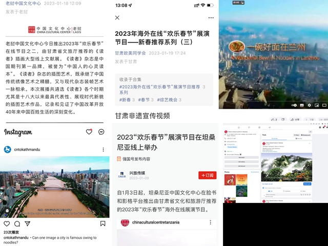 甘肃文旅Facebook、Instagram和Twitter海外账号开展2023年“欢乐春节”甘肃文化旅游资源的专题宣传和推广,贴文集中展现了甘肃新春活动、过年习俗、甘肃非遗、甘肃艺术、丰富多彩的市民生活等主题。通过国外甘肃友城、海外华人华侨社团,向20多个国家的学员和社团推送了“欢乐春节”文化旅游资源。