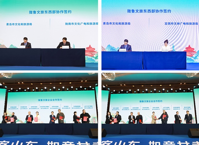 当天的推介活动由甘肃文化旅游推介形象大使王建萍主持,策划设计有主体推介、特色表演、合作签约和参观展览等别具陇原文旅风味的环节内容,生动形象地展现了“交响丝路·如意甘肃”的历史之美、山河之美、文化之美,全方位、多角度、立体式呈现了甘肃文旅“高开稳增、持续回暖”的强劲复苏势头。除全面介绍甘肃文旅资源及特色产品线路、旅游优惠政策,面向青岛客源市场投放5000份《丝绸之路(甘肃)自驾旅游电子护照》外;青岛结对帮扶的定西、陇南两市文旅局和甘肃兰铁国际旅行社有限公司分别作了主题推介;还组织定西和陇南两市文化广电和旅游局分别与青岛市文化和旅游局签订《战略合作协议》,甘肃保利国际旅行社与青岛好客五洲国际旅行社、甘肃幸福旅游集团与青岛华东国际旅行社等两地8家文旅企业(旅行社)代表分别签订了《“好客山东·如意甘肃”双向游市场化客源互送合作协议》。同时,推介现场精心布置了琳琅满目的甘肃文旅图片展和文旅产品(非遗)市集,营造了“感恩帮扶情、邀您陇上游”的浓厚氛围,切实让青岛参会嘉宾近距离、面对面地感知交响丝路的神奇瑰丽、体验如意甘肃的魅力风情。