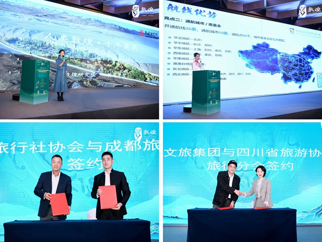 推介会上,敦煌市文旅局、敦煌研究院、莫高国际机场公司等单位有关负责人分别介绍了敦煌文化旅游资源、敦煌文化研学季品牌及优惠政策、敦煌文化旅游招商项目、莫高学堂研学项目、敦煌航线航班等,成都、敦煌旅行社协会共同签订了合作协议,敦煌文旅集团和四川省旅游协会研学旅行分会也达成了合作意向。