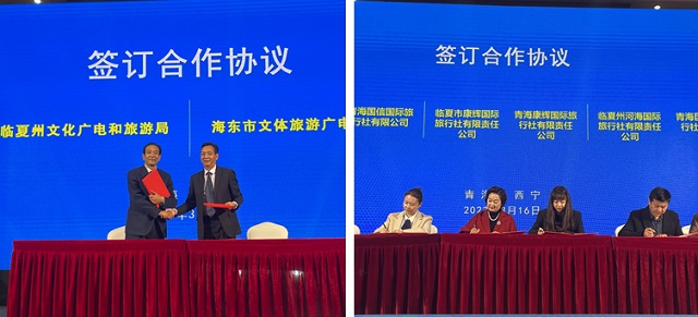 推介会上,活动主持人全面介绍了临夏州六条精品旅游线路和旅游优惠措施,临夏州文旅局向西宁市文旅局、海东市文旅局现场赠送了价值30.5万元的松鸣岩、白桦林、炳灵石林、大墩峡等A级景区门票8000张。临夏州民族歌舞剧团带来的《回族姑娘》《上去高山望平川》等特色歌舞的精彩演绎,不断把推介会氛围推向高潮。随后,临夏州文旅局和海东市文旅局签订了《文旅协同发展专项合作补充协议》,甘肃和青海两地的16家旅行社相互签订了合作协议。