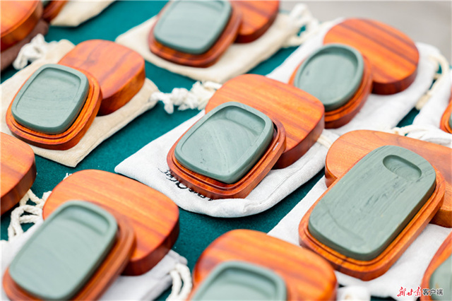 澳门居民品鉴了“靛坪大曲”酒后,与甘肃省酿酒技艺省级代表性传承人程万里攀谈起来,聊到兴起,又欣然买了两瓶酒,“回去与朋友分享”。中国四大名砚之一的甘肃洮砚以其色泽碧绿、温润细腻而著名,卢广成是国家级非遗代表性传承人卢锁忠之子,他带来的“文公子”洮砚系列产品,受到青睐。庆阳香包古拙质朴、色彩浓郁,甘肃省级非遗代表传承人刘兰芳创作的“十二生肖”“虎头帽”等古典与潮流并行的文创产品,精巧别致,惹人喜爱。