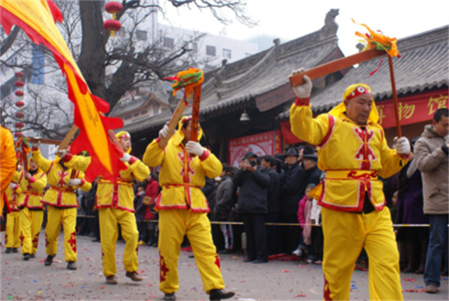 当地人将祭祀活动称之为“跳神”,舞者称之为“司公”。每逢正月、端午节以及夏收和秋收之后,秦安的“司公”们都要甩开膀子美美敲上一通,来表达美好心愿。“司公”们头戴红色发辫、身着红衣黑袍红冠,左手持绘有八卦图案鼓具,右手握牛筋鞭,舞动时鼓鞭敲击鼓面,手臂上环佩咚咚擦擦作响,“司公”们唱腔雄浑高亢,动作粗犷质朴、敏捷矫健,整个舞蹈节奏明快、气势恢弘,散发着西北大地浓郁的地方民族特色。
