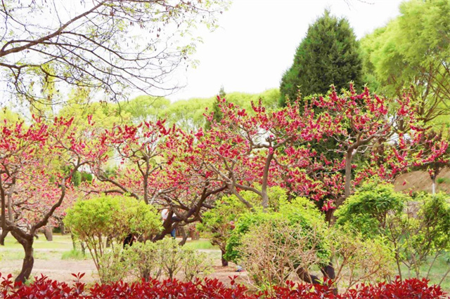 那一片绯红是什么,是《诗经》里的“桃之夭夭,灼灼其华”,一个月前还羞答答的粉嫩碧桃如今已出落得如此动人,虽然花期已经接近尾声,但那浓得化不开的色彩依旧动人心魄。