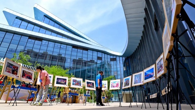 5月23日,在张掖市丝绸之路文化艺术中心的特色非遗、文创产品展览会上,游客认真观看特色非遗图片展。