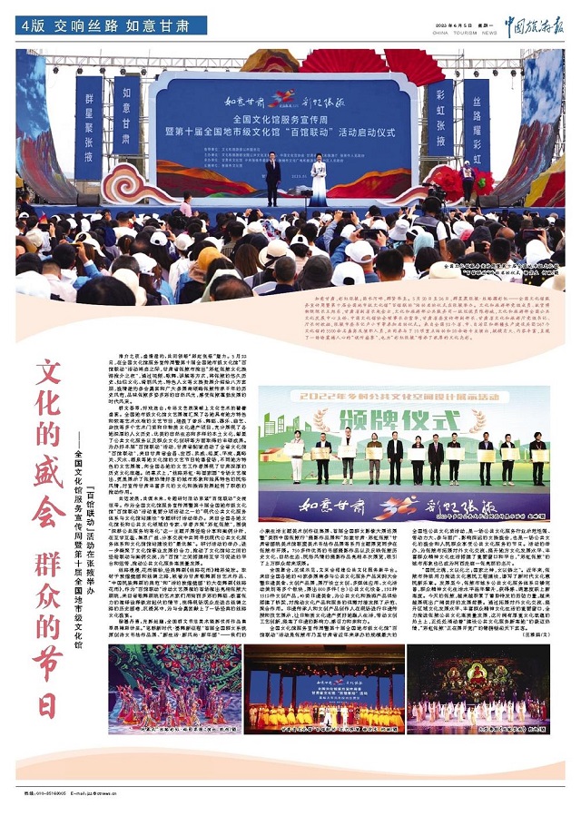 推介之夜,盛情邀约,共同领略“彩虹张掖”魅力。5月22日,在全国文化馆服务宣传周暨第十届全国地市级文化馆“百馆联动”活动将启之际,甘肃省张掖市推出“彩虹张掖文化旅游推介之夜”,通过视频、歌舞、讲解等方式,将张掖的悠久历史、灿烂文化、绮丽风光、特色人文等文旅资源介绍给八方宾朋,盛情邀约参会嘉宾和广大参展商领略张掖传承千年的历史风范,品味张掖多姿多彩的自然风光,感受张掖蓬勃发展的时代风采。