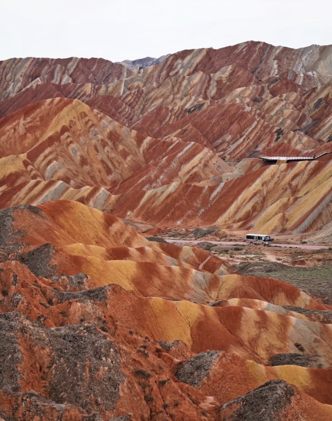 在方圆10多平方公里的范围内,随处可见多种颜色把无数沟壑、山丘装点得绚丽多姿。那层理交错的线条、色彩斑斓的色调、灿烂夺目的壮美画面,形成一个彩色童话世界。