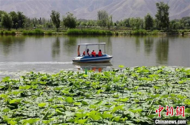 图为游客在白银湿地公园体验划船。