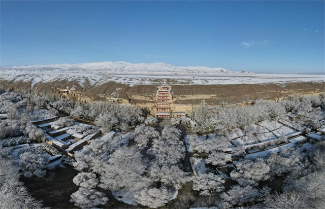敦煌莫高窟景区雪景(无人机照片)。新华社记者张智敏2022年3月25日摄
