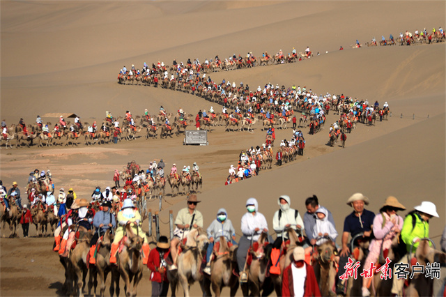 鸣沙山月牙泉景区吸引大批游客游玩。新甘肃·甘肃日报通讯员 张晓亮
