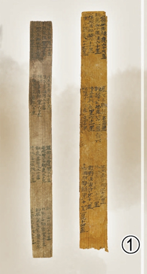 图①:汉简居延里程简(左)和悬泉里程简。甘肃简牍博物馆供图(新华社发)