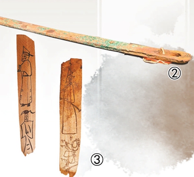 图③:描绘士吏图像的汉简。甘肃简牍博物馆提供。