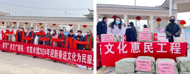 启动仪式上,白银市文化馆选送的歌伴舞《在收获的田野上》、古典伞舞《人间烟火》,唱出了新年新气象,舞出了来年新希望,得到了现场观众的阵阵掌声;白银市图书馆向平堡镇综合文化站捐赠了价值15000元的精品图书。现场开展了移动图书馆数字资源推广活动,向现场群众免费发放移动图书馆宣传彩页1000份、文创产品200份;开展微信公众号宣传推广活动,引导帮助大家关注“白银文旅”“白银市图书馆”“书香白银”公众号,增强大家对白银市文化事业的知晓度和关注度。市美术馆开展了“送福送春联——迎新春送文化下乡为民服务”活动,6位书法家挥毫泼墨,共向群众书写对联900余副,受到了群众的热烈欢迎。