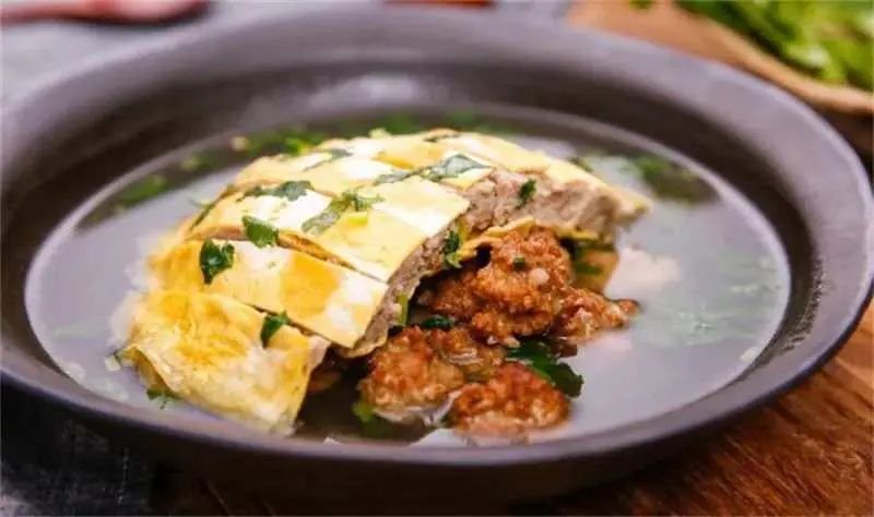 一碗杂烩——天水杂烩的历史文化十分悠久,属于一道特色菜,其制作过程异常讲究,首先把鸡蛋清和蛋黄搅匀,摊成薄饼;其次取新鲜五花肉剁碎,放入盐、粉面、花椒后拌匀,加在两层薄蛋饼中间压平,上笼蒸熟,切成条形,做成夹板肉。最主要的是以夹板肉为主,配以丸子,根据个人喜好,浇上鸡汤,撒上葱花、香菜或木耳等,盛入汤盆,量足汤多,荤素搭配,边喝边吃,不油不腻,味道鲜美,是席面上必备的一道老天水菜。