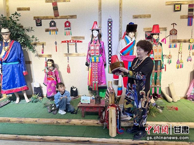 图为柯璀玲在自建民俗博物馆介绍裕固族服饰。