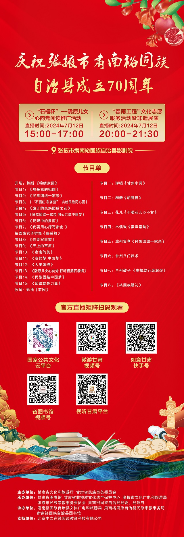 为庆祝张掖市肃南裕固族自治县成立70周年,由甘肃省文化和旅游厅、甘肃省民族事务委员会主办,甘肃省图书馆、甘肃省非物质文化遗产保护中心、张掖市文化广电和旅游局、张掖市民族宗教事务委员会、肃南裕固族自治县县委县政府承办,北京中文在线阅读教育科技有限公司支持的“石榴杯”——陇原儿女心向党阅读推广活动及“春雨工程”文化志愿服务活动暨非遗展演将于7月12日在张掖市肃南裕固族自治县影剧院举办。活动将通过国家公共文化云平台、“微游甘肃”视频号、“如意甘肃”快手号、“甘肃省图书馆”视频号、“视听甘肃”平台进行同步直播。欢迎广大观众扫描直播二维码观看。