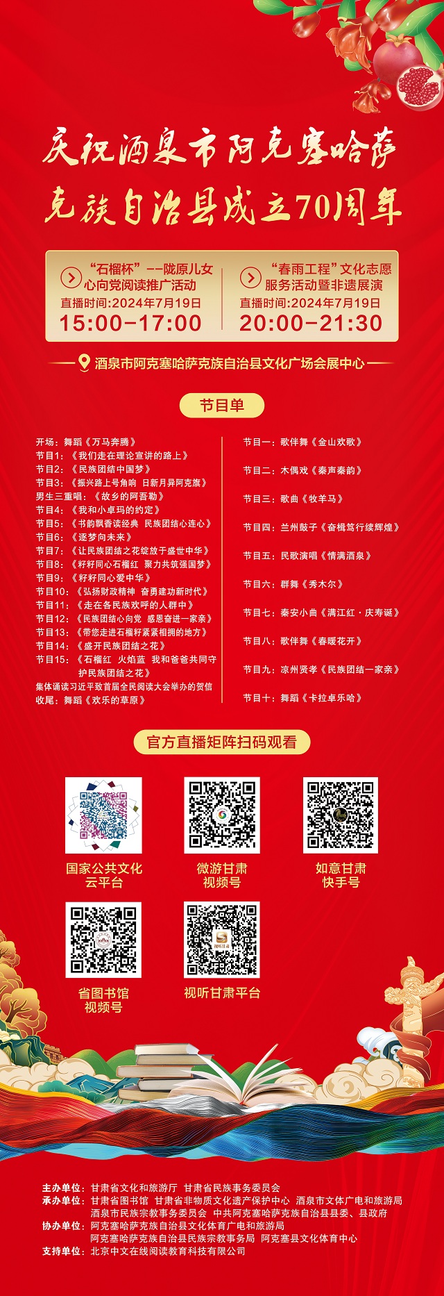 铸牢中华民族共同体意识,推进中华民族共同体建设,中国式现代化就有了更为强大的主体、更加强劲的动力。为深入学习宣传贯彻习近平文化思想、习近平总书记关于加强和改进民族工作的重要思想,讲好中华民族故事,构筑中华民族共有精神家园,庆祝酒泉市阿克塞哈萨克族自治县成立70周年,由甘肃省文化和旅游厅、甘肃省民族事务委员会主办的“石榴杯”——陇原儿女心向党阅读推广活动及“春雨工程”文化志愿服务活动暨非遗展演将于7月19日在阿克塞文化广场会展中心举办。活动将通过国家公共文化云、视听甘肃、微游甘肃视频号、甘肃省图书馆视频号、甘肃省文化馆视频号等平台进行同步直播。欢迎广大观众扫描直播二维码观看。(文/甘肃省文化和旅游厅 欧阳尔宝)