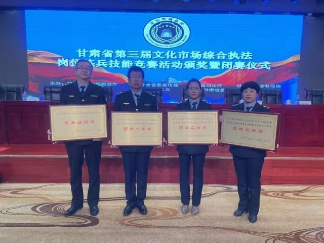 武威市文体广电和旅游局积极组织全局执法人员参加省市线上线下法治宣传教育知识培训,行政执法资格考试合格率100%,真正做到学理论、强业务、提能力、促发展。2023年2月,在省委宣传部等7部门组织的“第三届全省文化市场综合行政执法岗位练兵技能竞赛活动”中,武威市文体广电和旅游局共获得优秀组织奖、网络案件证据固定及平台应用一等奖、案卷纠错团体二等奖、文书制作及案卷归档三等奖等四个团体奖,文化市场综合行政执法工作人员以扎实的实战技能获得全能奖、个人竞赛科目一等奖等五个个人奖,进一步打响了武威文化市场执法的“文旅铁军”品牌。