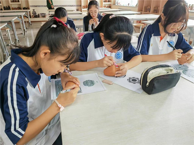课余时间,同学们来到工作坊正在绘制陶罐花纹。