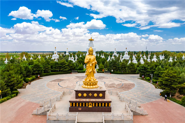 秋日的凉州会盟纪念馆,秋意深深,云影悠悠。湛蓝的天空下,云儿似仙袂飘举,或舒或卷,如梦如幻,白塔、萨班铜像立于林间,如同飞虹。