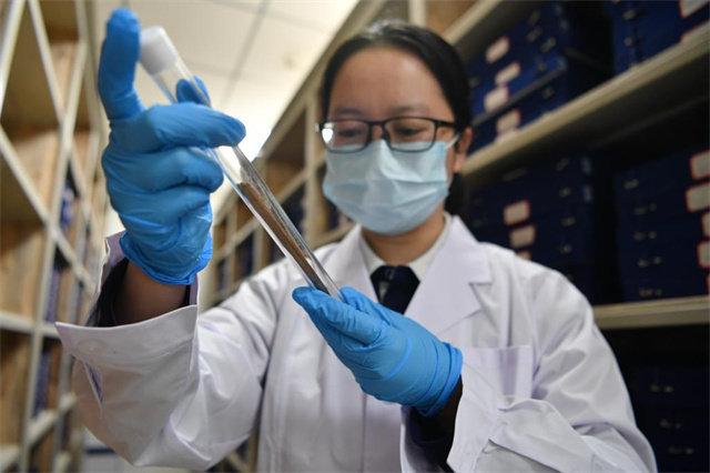 甘肃简牍博物馆科技保护部文物库房管理员杨升正在文物库房内查看简牍保存情况。新华社记者 陈斌 摄