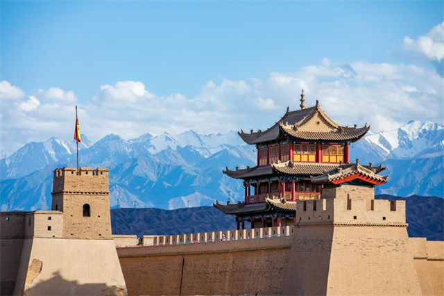 祁连雪山与嘉峪关关城交相辉映。新华社记者 郎兵兵 摄