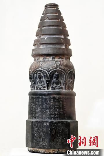 高善穆石造像塔出土于甘肃酒泉市石佛湾子,由黑色玄武岩雕成,高44.6厘米,底径15.2厘米,由宝顶、相轮、踏颈、覆钵、经柱、基柱六部分组成,基座已丢失。