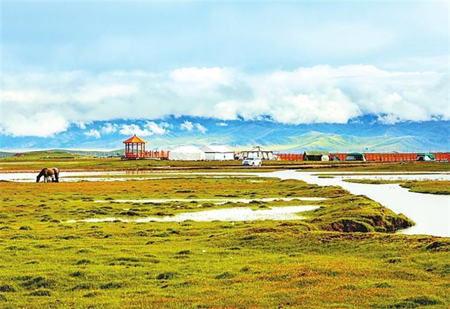 在这片湿地上,黄河的支流蜿蜒曲折,形成各式各样的曲线。阳光下,这些弯弯曲曲的大小沼泽,犹如一条条银色的丝带,闪闪发光。触手可及的蓝天白云无际无涯,像洗涤过似的,亮得耀眼。牛羊满山坡,宛如散落在人间的珍珠。这种原始的自然美景和丰富的生态资源,让阿万仓湿地成为一个理想的旅游目的地。