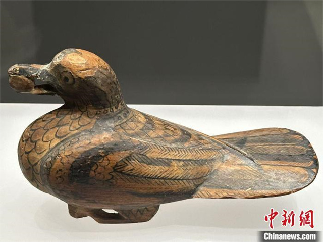 图为正在展陈的彩绘漆木鸠。