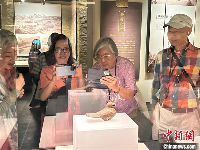 图为游客在参观彩绘漆木鸠。