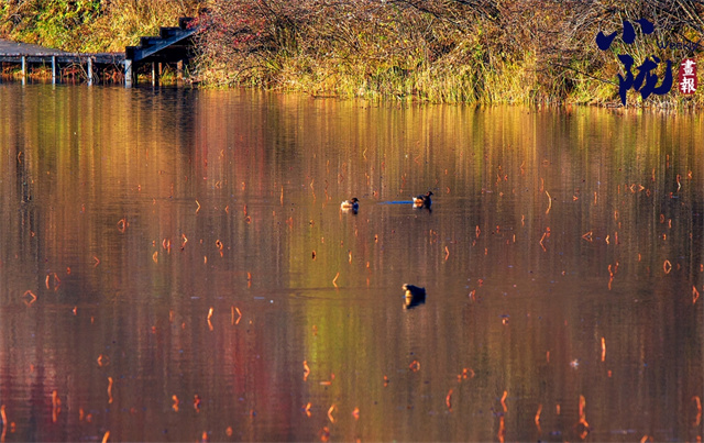 湫水深不可测,湫池依偎在深林密树旁边,湫面荡起缕缕波纹,浮光泛金,一群悠闲的野鸭在水面上游来游去。
