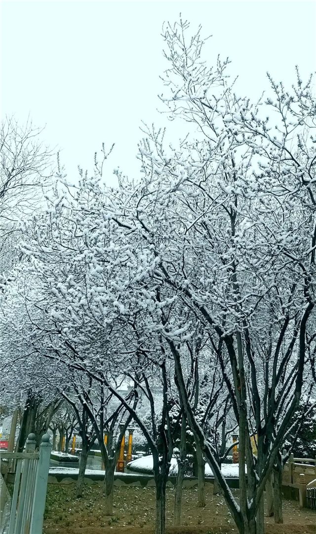 平日张扬的松柏,此刻,枝叶被积雪轻柔包裹。绿白相间,宛如放大版精致的“雪绒花”,抖擞着身姿迎接游人。蜿蜒小径成了雪的画布,行人踏出的不规则脚印是灵动的笔触,记录着早行者探索雪景的踪迹,路边长椅堆起雪的“靠枕”似在静静等候哪位旅人驻足歇脚,共赏这漫天飞雪。